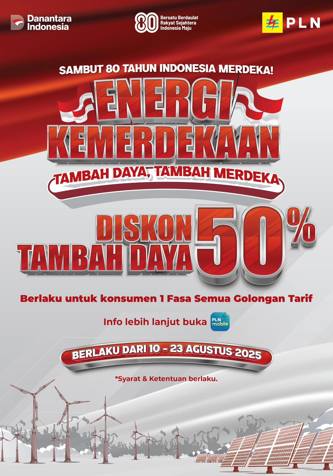 Jakarta, malutpost.com -- Dalam rangka menyemarakkan Hari Ulang Tahun ke-80 Kemerdekaan Republik Indonesia, PT PLN (Persero) menghadirkan program spesial bertajuk “Energi Kemerdekaan”. Melalui program ini, pelanggan dapat menikmati diskon tambah daya listrik 50% yang berlangsung mulai 10 hingga 23 Agustus 2025.