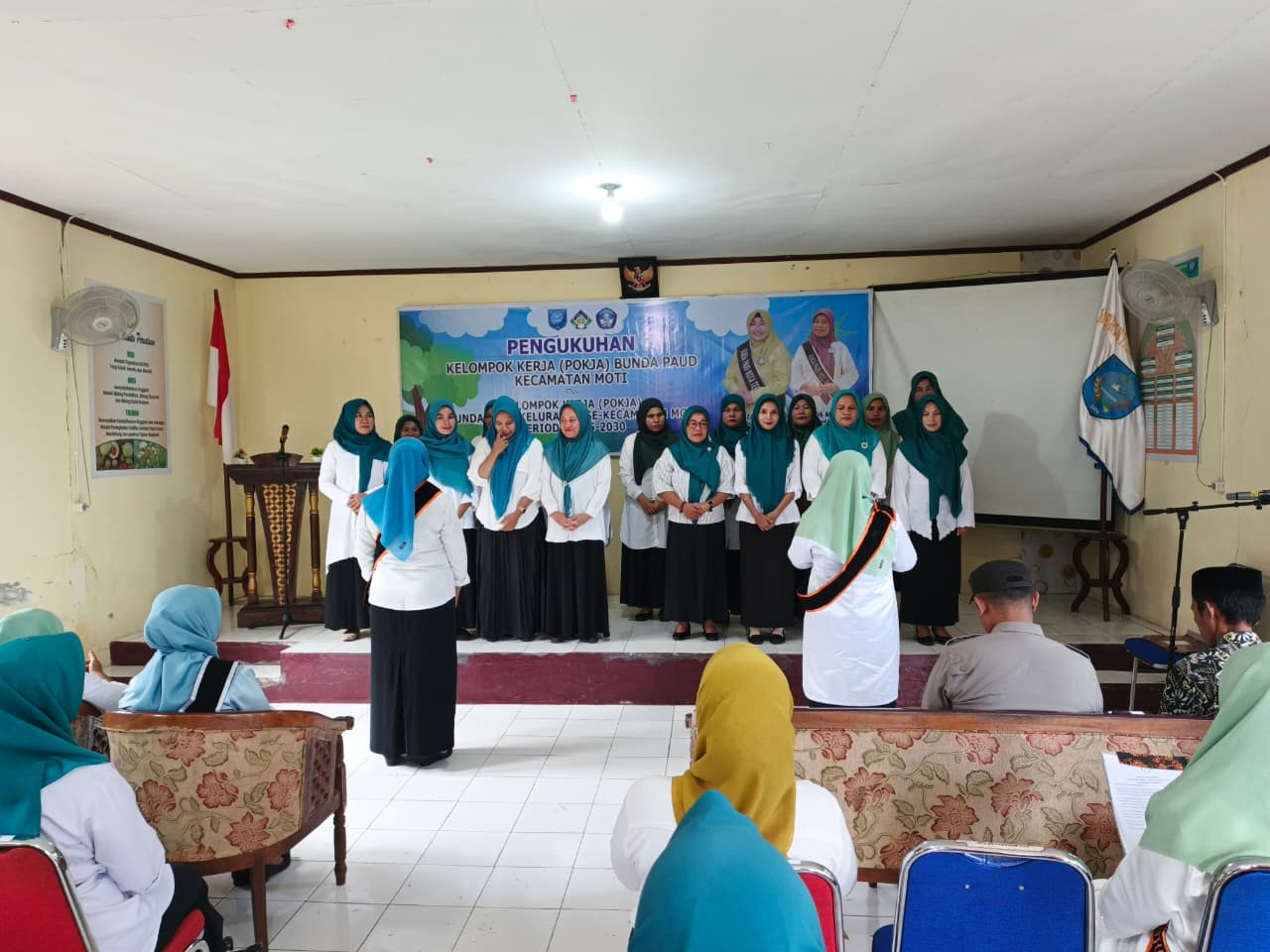 Acara pengukuhan dihadiri oleh Camat, Kapolsek, Kepala Puskesmas, koordinator Penyuluh KB, Lurah se Kecamatan Pulau Moti dan Pengurus Pokja Bunda PAUD se Kecamatan Pulau Moti.