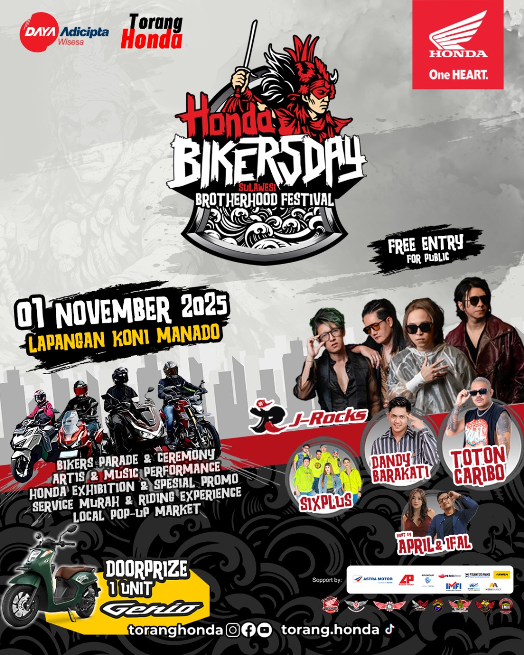 Manado, malutpost.com -- Kota Manado akan menjadi saksi kemeriahan salah satu ajang paling dinantikan para pecinta sepeda motor Honda, yaitu Honda Bikers Day (HBD) Regional Sulawesi 2025. Acara ini akan digelar pada Sabtu, 1 November 2025 di Lapangan KONI Manado dengan mengusung tema “Brotherhood Festival”.