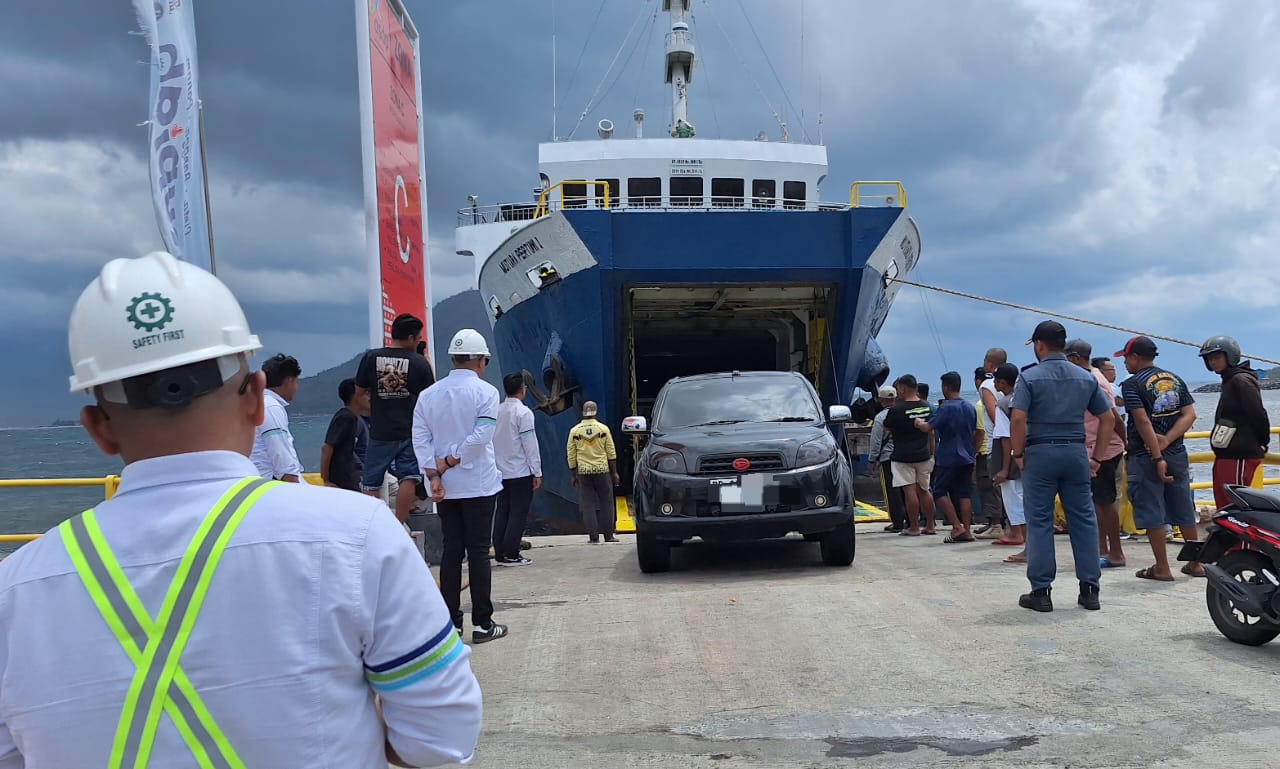 Kapal Feri Mutiara Pertiwi I saat melakukan bongkar muatan di Pelabuhan Bastiong.