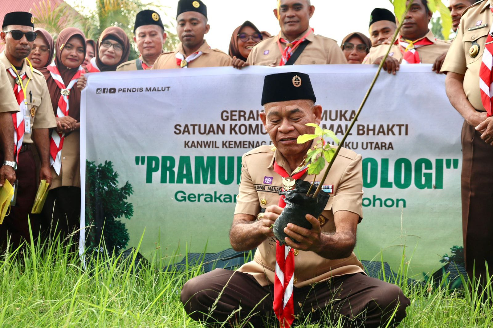 Sofifi, malutpost.com -- Gerakan Pramuka Satuan Komunitas (Sako) Amal Bhakti Kantor Wilayah Kementerian Agama Provinsi Maluku Utara menggelar aksi penanaman pohon dalam semangat “Pramuka Ekoteologi” Jum’at (17/10/2025) di Lapangan Kanwil Kemenag Malut, Sofifi.