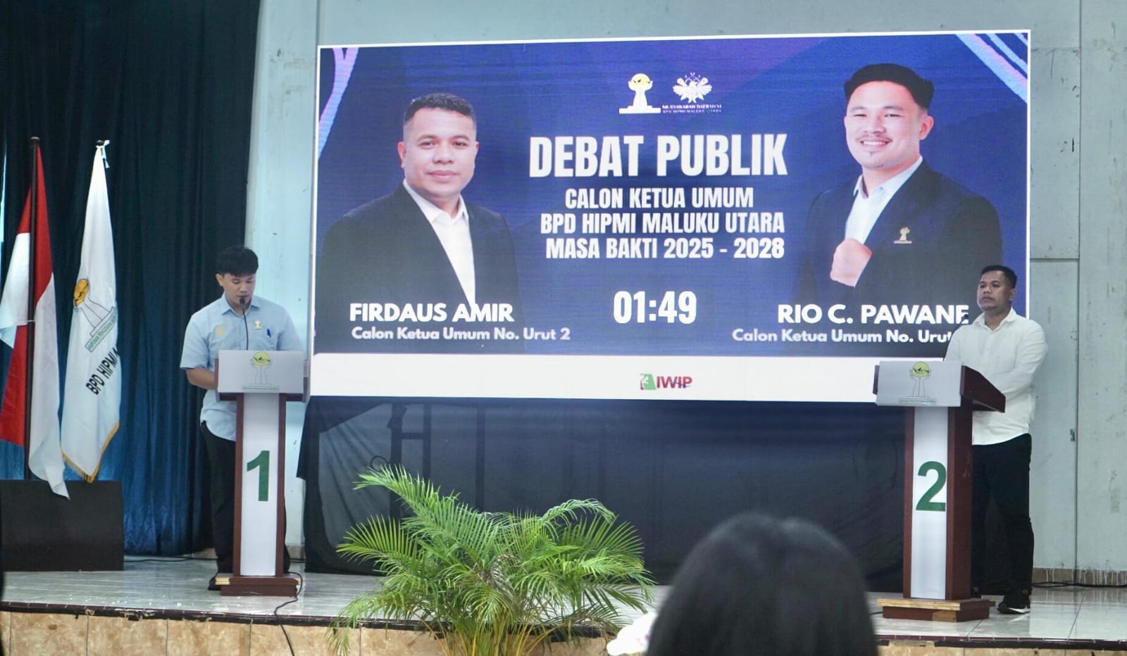 Ternate, malutpost.com - Rio Christian Pawane menyampaikan tiga visi saat debat publik calon ketua umum (caketum) Himpunan Pengusaha Muda (HIPMI) Maluku Utara periode 2025-2028, yang berlangsung di Jati Hotel, Kota Ternate, Minggu (19/10/2025), malam.