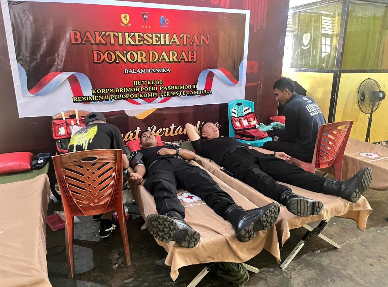 Ternate, malutpost.com -- Kompi 2 Ternate Jambula Batalyon B Pelopor Resimen II Pelopor Pasukan Brimob III, melaksanakan kegiatan donor darah dalam rangka memperingati hari Ulang Tahun (HUT) Ke-80 Korps Brimob Polri, Jumat (24/10/2025). Kegiatan yang dilaksanakan, merupakan kerja sama dengan Palang Merah Indonesia (PMI) Provinsi Maluku Utara, sebagai wujud nyata pengabdian, kepedulian, serta semangat kemanusiaan Korps Brimob Polri terhadap sesama.