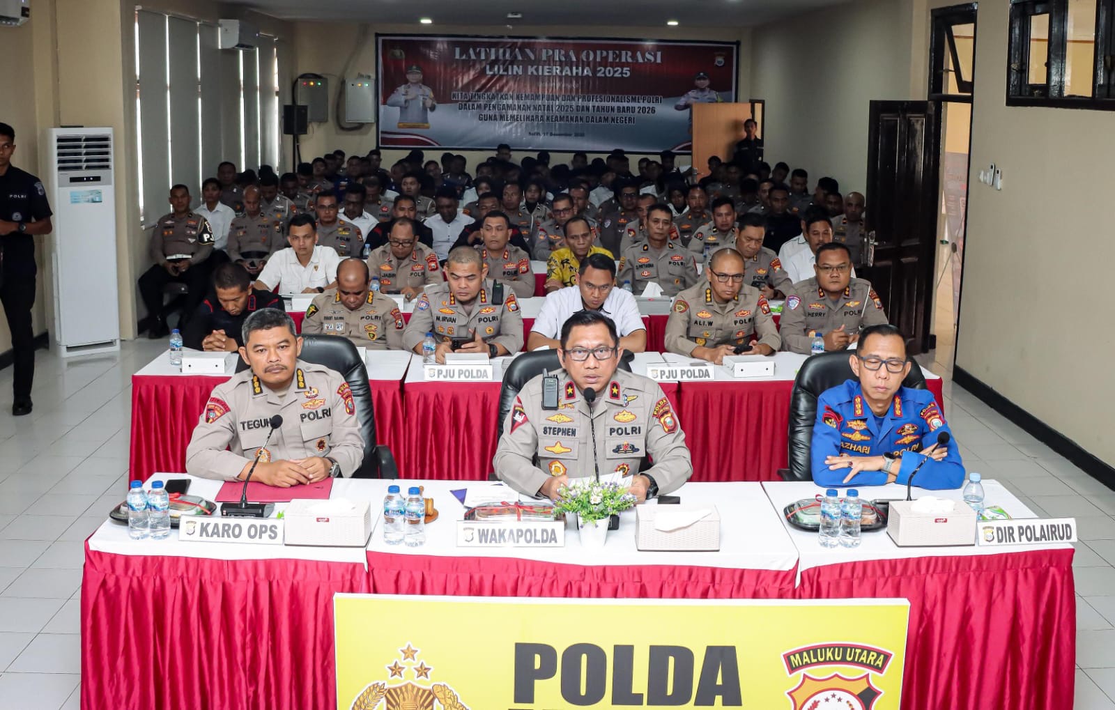 Sofifi, malutpost.com -- Wakapolda Maluku Utara Brigjen Pol. Stephen M. Napiun, telah membuka pelaksanaan Latihan Pra Operasi (Latpraops) Lilin Kie Raha 2025. Pembukaan latpraops ini, dalam rangka pengamanan Natal 2025 dan Tahun Baru 2026, yang berlangsung di Aula Rupattama Polda Maluku Utara (Malut), Kamis, (18/12/2025).