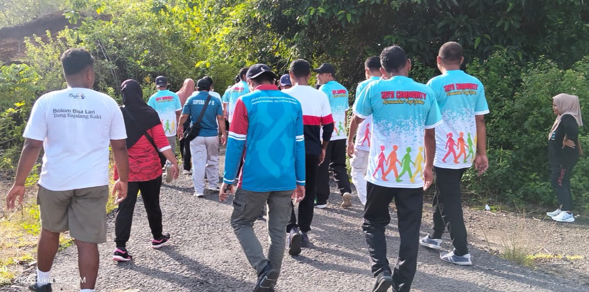 Kegiatan jalan sehat melibatkan seluruh pegawai kantor camat, baik ASN, PPPK & PTT, staf Puskesmas Perawatan Moti dan Koordinator Penyuluh KB Kecamatan Moti.