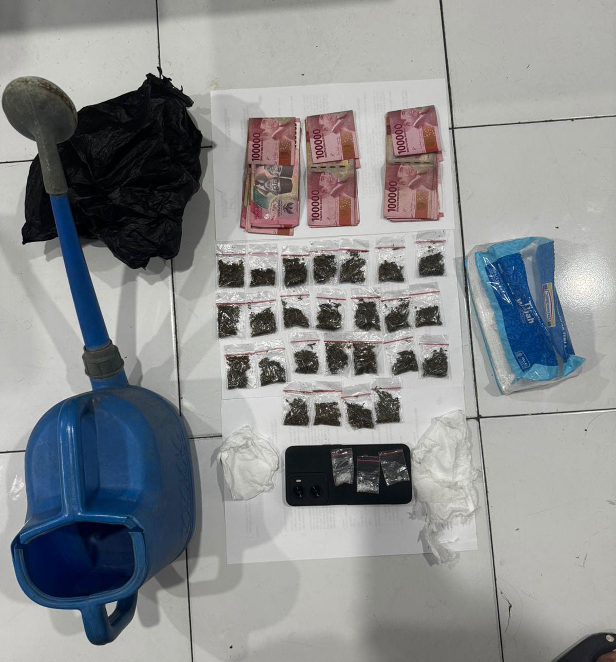Sementara Apriyanto ditangkap di Kelurahan Kalumata, Kecamatan Ternate Selatan, dengan barang bukti 1 buah kantong plastik hitam berisi 25 sachet plastic bening berukuran kecil berisikan ganja dengan berat bruto 21.88 gram, 3 sachet plastik bening berukur kecil berisikan sabu dengan berat bruto 1,46 gram, uang Rp3.000.000 yang merupakan hasil penjualan sabu dan 1 unit handphone merek oppo A77S.