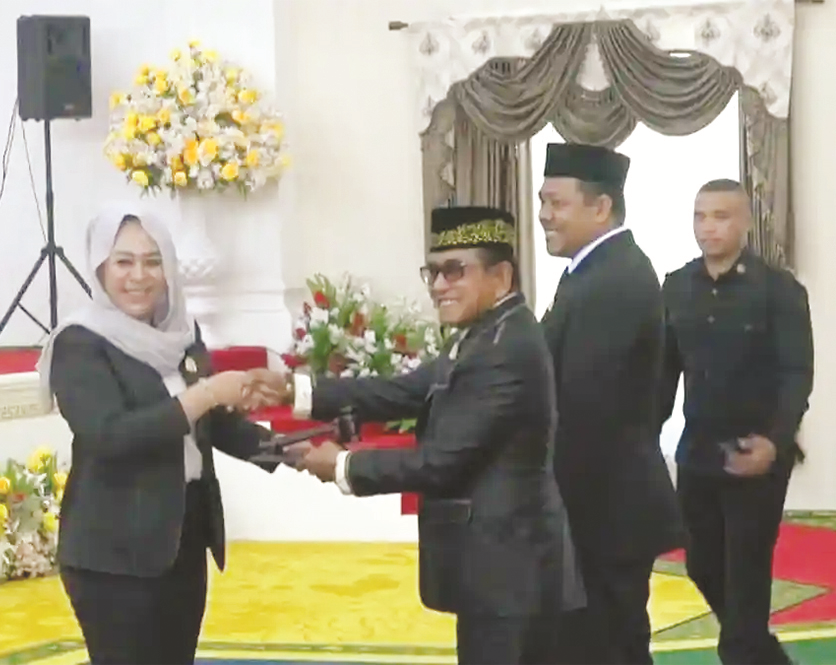 PELANTIKAN: Penyerahan Palu Sidang dari Eks Ketua DPRD Pulau Taliabu, Hj Meilan Mus, ke Ketua DPRD , Moh Nuh Hasi.