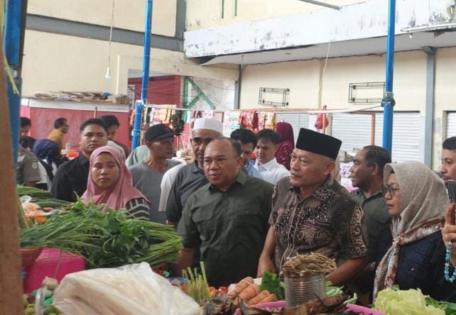Wagub Malut Sarbin Sehe saat melakukan pemantauan harga dan ketersediaan sembako di pasar.