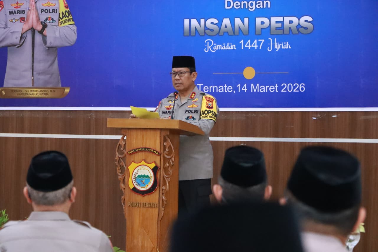 Ternate, malutpost.com -- Polda Maluku Utara (Malut) menggelar buka puasa bersama dengan insan pers di Aula Kantor Polres Ternate, Sabtu (14/3/2026).