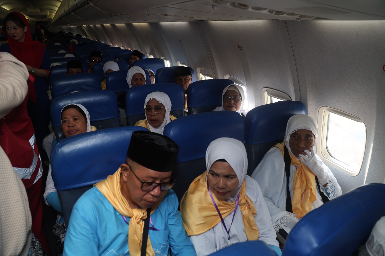 Jemaah calon haji Maluku Utara di pesawat menuju Makassar. (Foto: Andri)